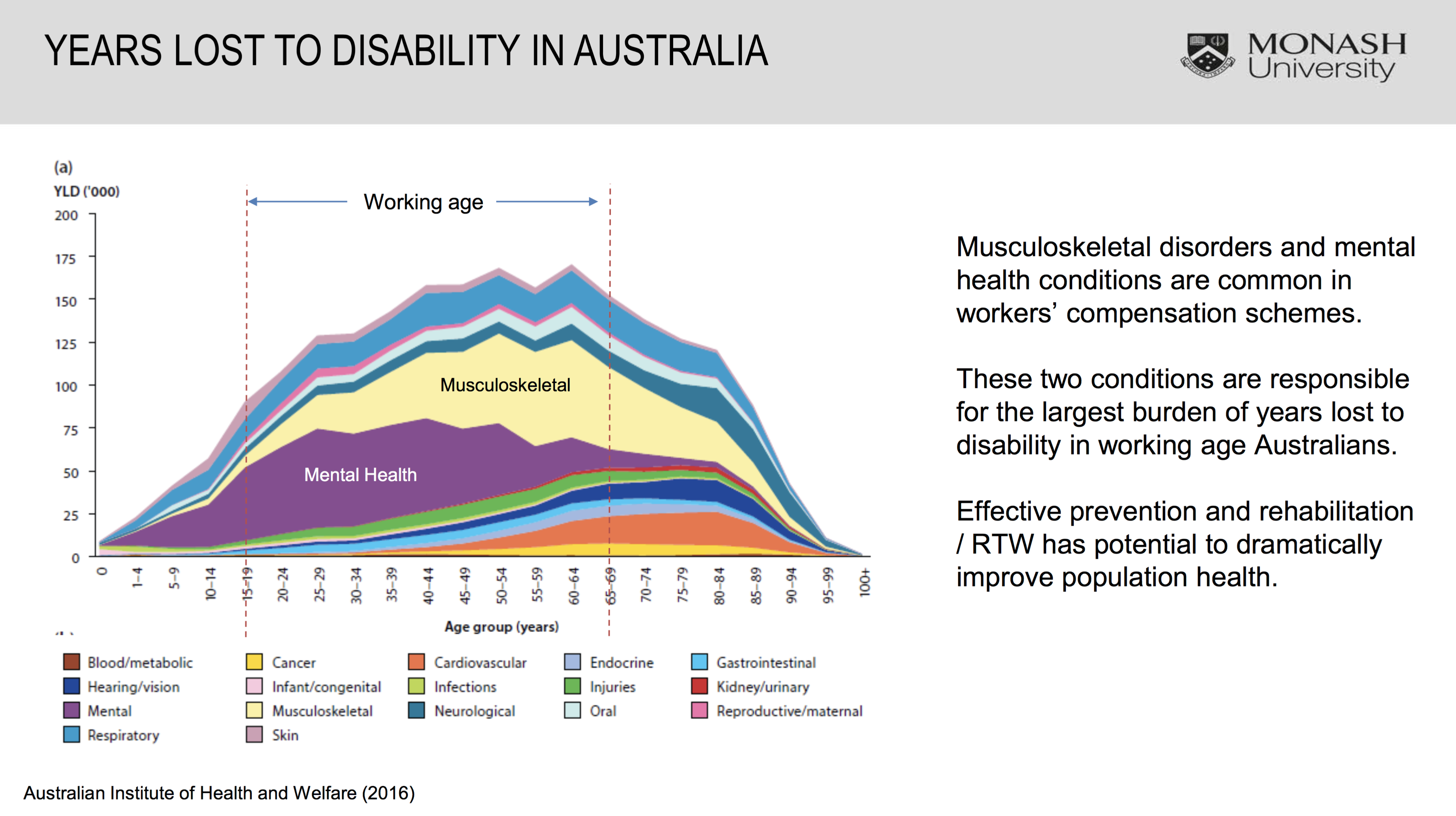 In working age groups, musculoskeletal disorders and mental health disorders are by far the most important conditions. Mental health disorders predominate in younger working age people and musculoskeletal conditions dominate in older workers. The slide below illustrates this very nicely.