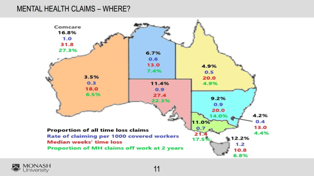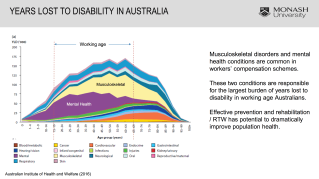 In answer to a question about the overall direction of workplace health in Australia, Alex Collie suggested that prevention of physical injuries has improved significantly, but that the incidence of mental health disorders was increasing with the overall burden of work disability (taking into account both claims incidence and duration rates) probably still increasing nationally. It is also evident that there is very little data about the extent of secondary mental health disorders, as most data provides only diagnostic information about the primary injury. Secondary disorders are, in my experience, almost universal in complex and protracted claims.