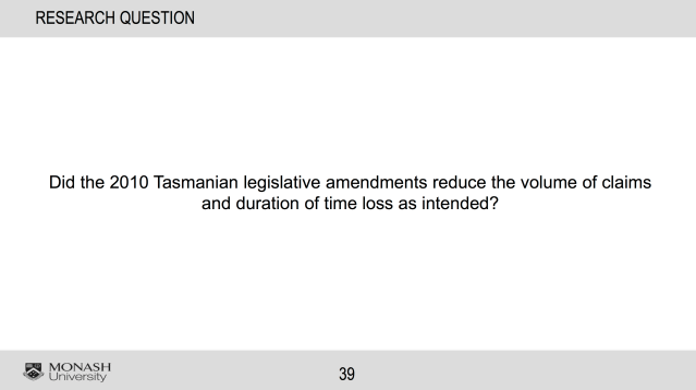 The study relating to the RTWIMM considered whether it achieved the stated goal of improving RTW outcomes. The data suggested it did not, but introduction coincided with changes to ‘step down’ provisions making them less severe in terms of both timing and extent, again making interpretation difficult. Here are the relevant slides: