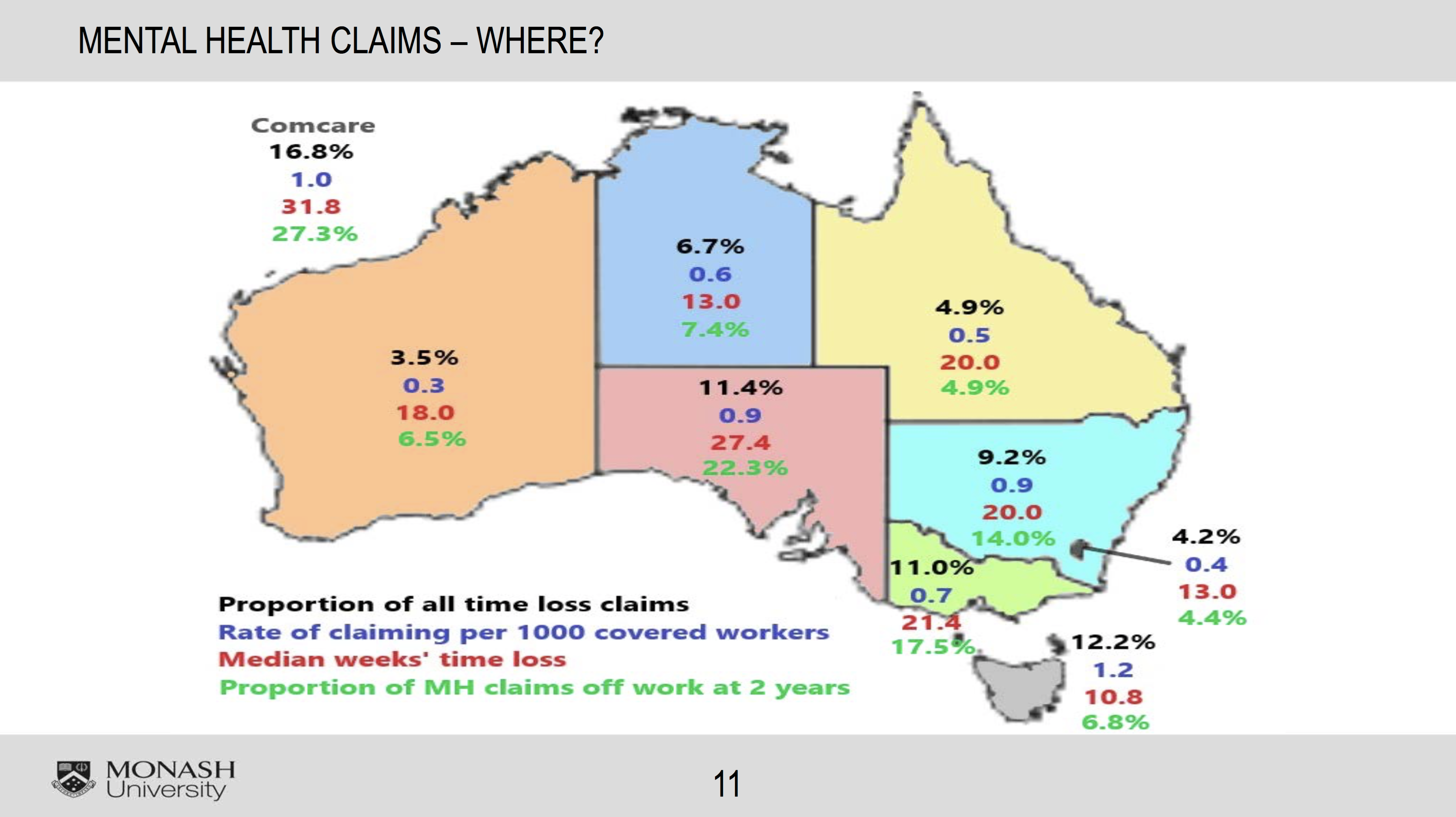 Differences in claim patterns for mental health disorders were evident around Australia with Tasmania having the highest incidence of such claims – 1.2 claims per 1000 workers (higher even than Comcare) but the best rate in Australia in terms of median time off work (compensated time off) at 10.8 weeks, compared to 31.8 weeks for the highest, Comcare.