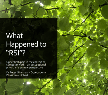 My (obviously anecdotal) experience is that many workers with computer associated chronic pain do not make claims because of the associated stigma of these disorders. While the official statistics that include this subject suggest only 5-10% (or 20% in office-workers) of work-related MSDS’s are due to ‘repetitive movement, with low muscle loading’, the lack of a category for specific computer-associated disorders, limited reporting and inordinate levels of disability often affecting young workers, suggests this area is receiving less attention that might be warranted in terms of real impact on workers and their work capacity.