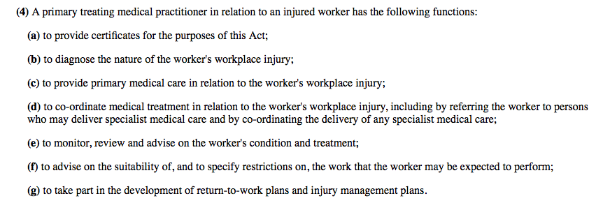 There are already some legislative provisions about the role of doctors in managing work-related injury. For example, Tasmanian workers compensation legislation sets out the role of the Primary Treating Medical Practitioner (PTMP) as follows:
